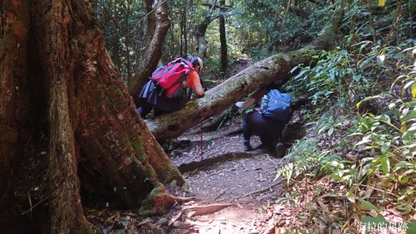 前往鵝公髻山三角點的步道地形多變, 大部份都是原始的土徑. 途中有些地方需要穿過倒木, 爬越樹幹或大石, 有些地方需要拉繩, 但都不至於太困難.