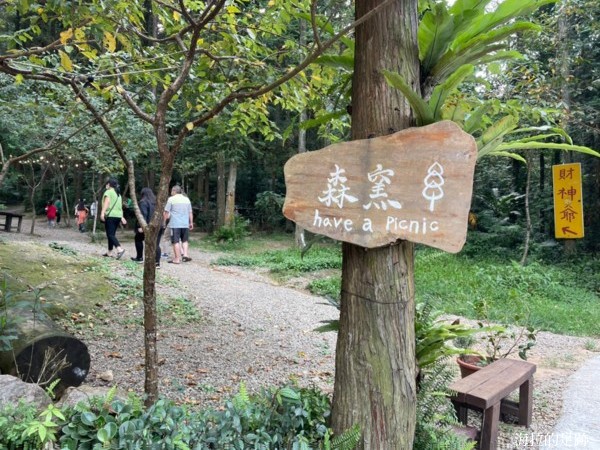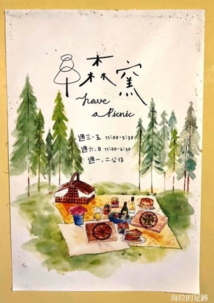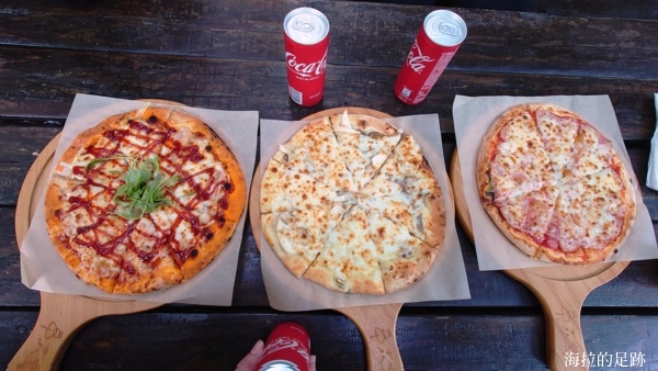 感覺才拍一下下而已, 震動器就響了. 填飽肚子比較重要, 趕緊先去拿披薩. 今天選擇戶外的木桌椅用餐, 第一次坐在森林裡享用披薩吔, 吃起來格外地香~~