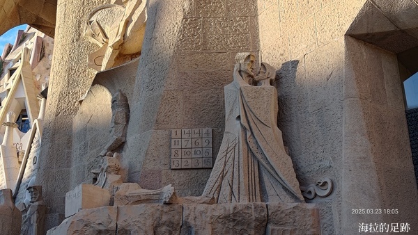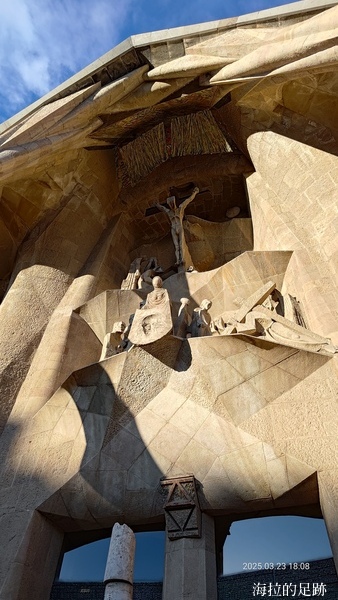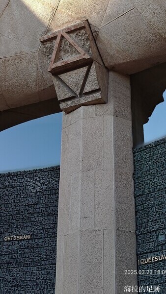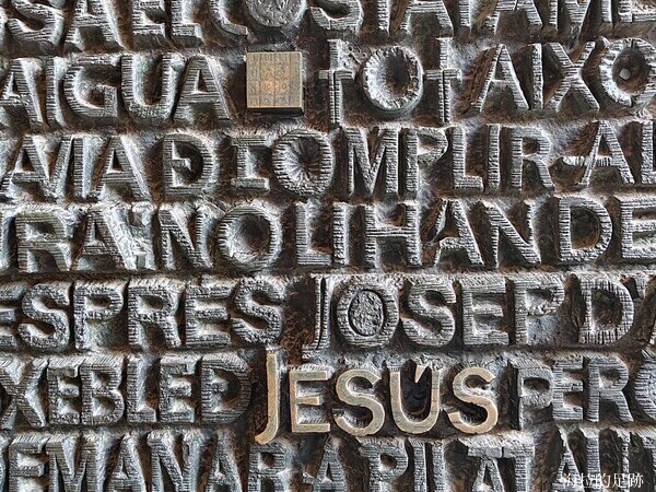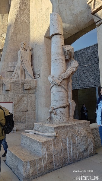 福音門入口正前方有一座巨大的雕塑, 耶穌獨自一人被綁在臺柱上受鞭刑, 這是遊客可以近距離貼近耶穌的唯一一座雕塑, 很難拍到空景照, 海拉等了半天無法拍到空景照及合照, 只好去福音門下半部開啟的門扇上找耶穌的英文名字 “JESUS”, 它被摸的很光亮.