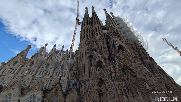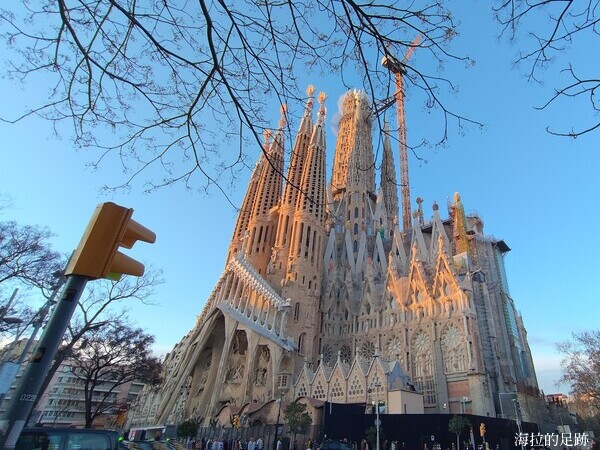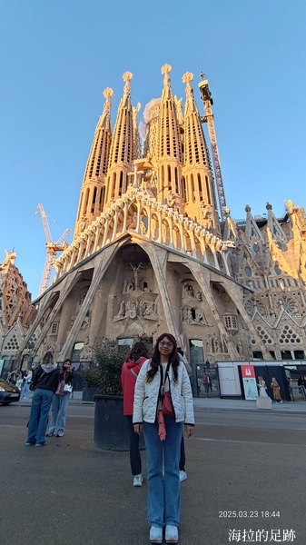 最後要離開聖家堂時雖然已經快七點了, 但這時雨停了, 太陽光正照耀在受難立面的高塔上, 海拉也終於拍到了與聖家堂的合照且是背景人頭較少的全身照, 著實開心呀~~ 拍完照後, 飛快地趕往餐廳.