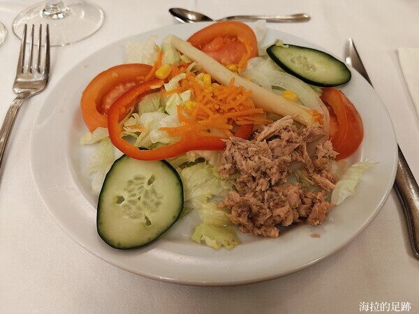 今晚的餐廳是 ELS PORXOS, 行健旅遊招待我們紅酒, 為了讓大家盡興, 領隊說紅酒無限量供應. 第一道鮪魚沙拉表現平平.