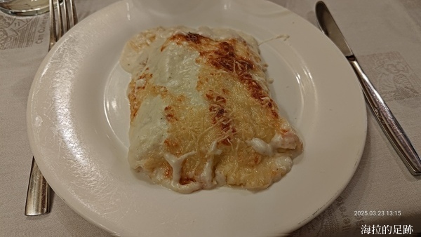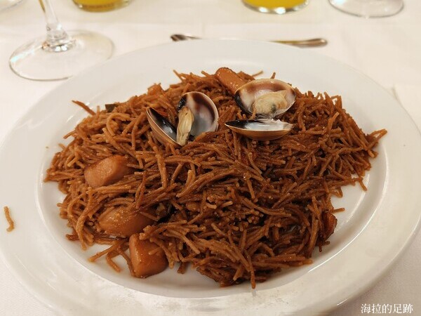 第二道主食是地中海海鮮細麵, 海鮮看起來不多, 但都埋藏在麵裡面, 喜歡重口味的人會讚不絕口, 海拉原本想清盤, 但領隊說還有牛排, 所以海拉只吃了1/3, 剩下的依舊由團友代勞.