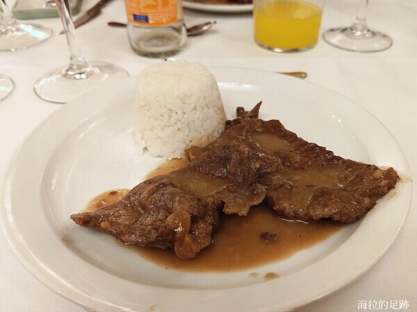 牛排有二小薄片, 居然搭配白飯, 真是絶了. 在台灣都很少看到牛排搭米飯, 這事竟然會發生在西班牙巴塞隆納.