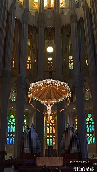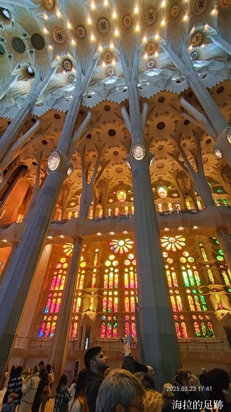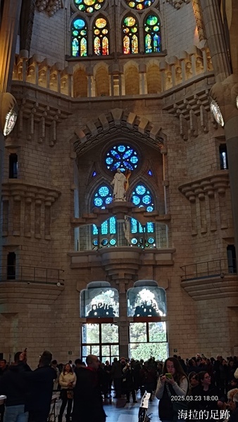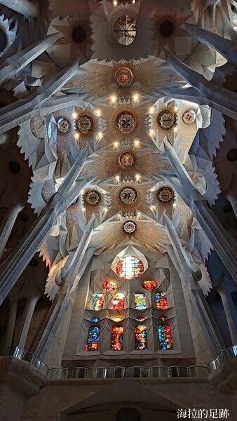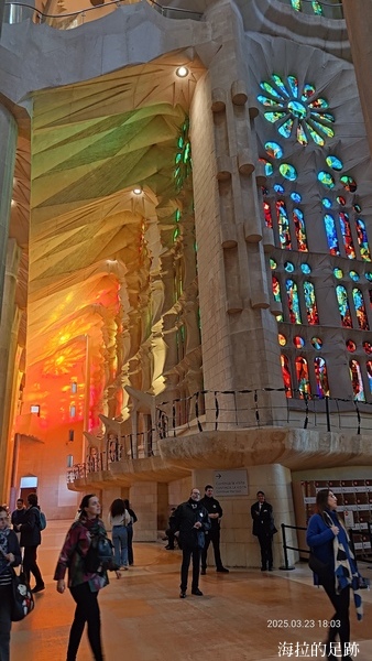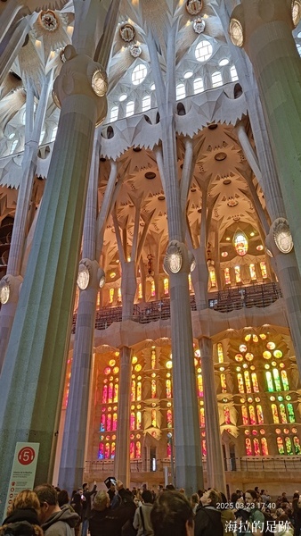 教堂的設計帶有強烈的自然色彩, 教堂內部東邊是偏藍綠的冷色調彩繪玻璃, 西邊則是暖色調的彩繪玻璃. 其實不管是什麼色調, 不同的季節, 不同的時間都會呈現不同的光彩. 當然, 不管何時來都一樣人潮洶湧, 在遊客如織的聖家堂內少了份莊嚴的宗教氛圍.