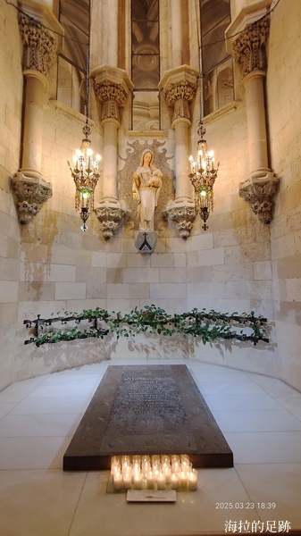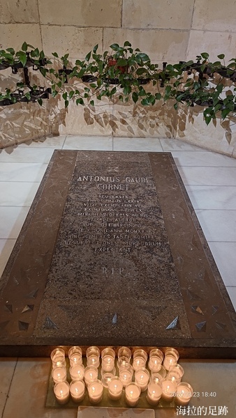 導遊跟我們指了個方向說那裡可以走到地下室, 去往高第的長眠之處. 我們原本跟著人龍排隊, 但有工作人員問我們是不是要下去教堂做祈禱, 我們說不是, 要下去看高第. 他跟我們說要走出聖家堂大門, 從旁邊的小門再次過安檢後才能進入. 我們趕在六點半前通過安檢並順利地來到高第的靈前瞻仰.