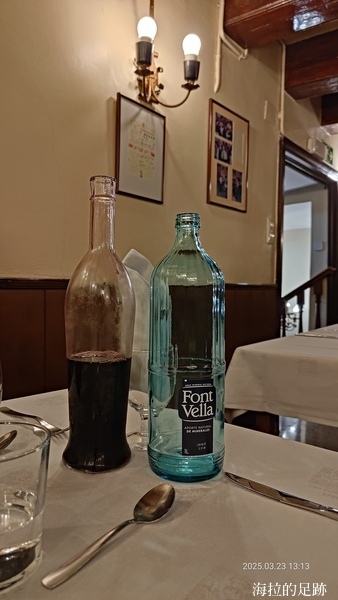 每桌有一瓶礦泉水跟紅酒, 這瓶紅酒沒有酒標, 但味道還不錯. 這一餐沒有沙拉, 直接上主食烤寛麵條, 香滑濃郁, 搭配紅酒很解膩. 根據歷史記載, 在加泰隆尼亞, 人們用聖誕節當天剩下的燉肉來製作義大利寬麵條, 以慶祝聖埃斯特韋節.