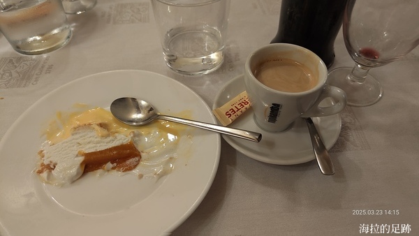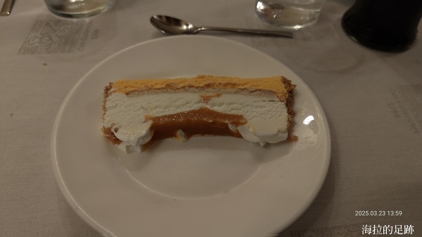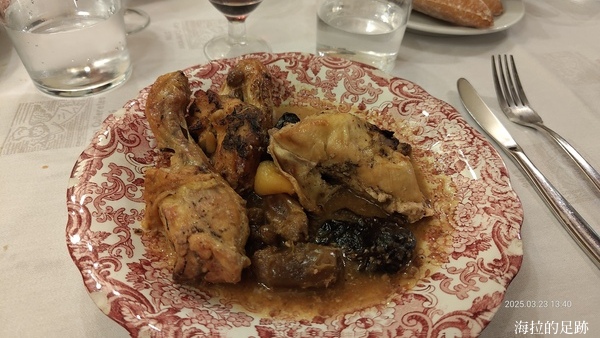 主菜是加泰隆尼亞燉雞, 這道算是鎮店名菜, 將李子、杏桃、椰棗、葡萄乾和松子放入醬汁中慢燉, 使其甜味融入雞肉, 軟嫩香醇, 份量對海拉來說太多, 幸好有團友幫忙吃. 飯後還有甜點跟咖啡或茶. 客人很多, 但服務生太少, 以至於甜點都吃完了, 咖啡才在三催四請後上桌.