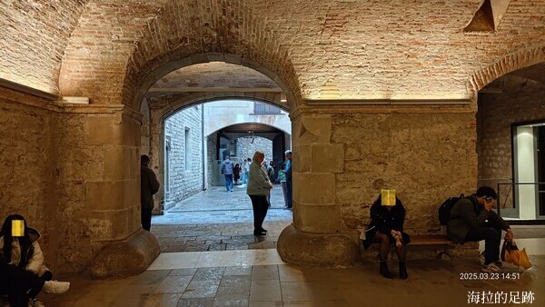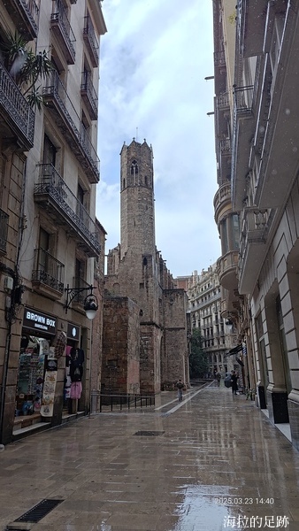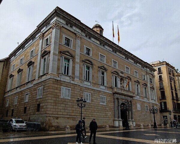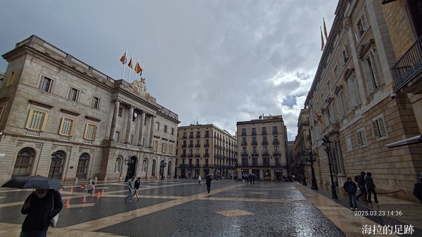離開餐廳時又下大雨了, 但行程依舊要繼續, 有傘的撐傘, 沒傘的拿東西擋, 導遊帶著大家往畢卡索美術館移動. 途中經過舊城區的聖若梅廣場 (Plaça de Sant Jaume), 這裡是巴塞隆納最古老的公共空間, 也是重要的政治中心. 廣場的二邊各有一棟歷史悠久的建築物, 加泰隆尼亞自治區大樓 (Palau de la Generalitat de Catalunya) 與巴塞隆納市政廳 (Ajuntament de Barcelona).