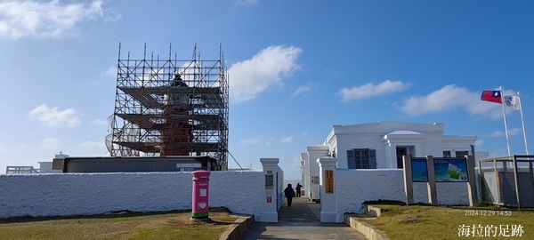 當我們停好車朝著漁翁島燈塔前進時, 遠遠就看到搭的方方正正的鷹架, 燈塔居然在整修, 實在可惜. 白色的燈塔建築群前方有個很顯眼的粉紅色郵筒, 郵筒上寫著它的名字「幸福郵筒」, 下方還有一顆心, 真是浪漫. 它不是裝置藝術喔, 是真的可以投遞的郵筒, 想要來個浪漫又幸福的體驗記得自備明信片及郵票.