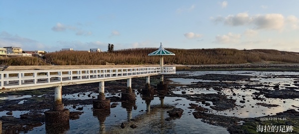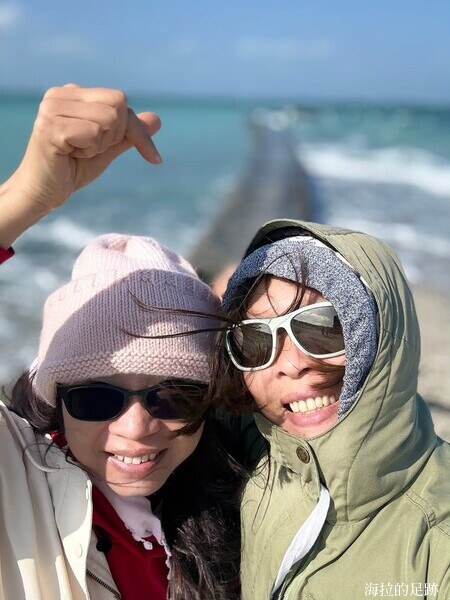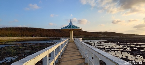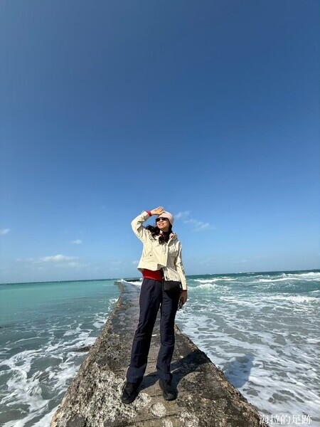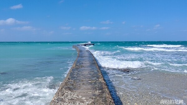 雙曲橋正好位在潮間帶上, 天氣好又遇上漲潮的時候, 蔚藍的天空與腳下湛藍的的海水, 交織出一幅海天美景; 退潮後露出大片潮間帶岩盤, 當地的居民會趁這個時候來撿拾螺貝或撈魚. 我們來的時候正值退潮, 沒看到其他居民, 就 Zoe 跟海拉包場啦!