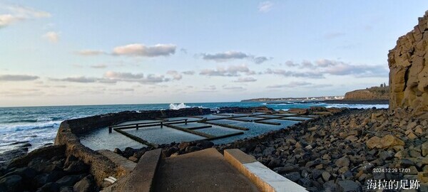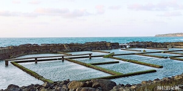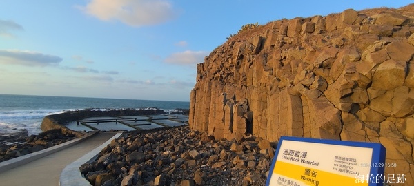 池西岩瀑下方的九孔池是近年來的打卡熱點, 但可得挑對時間來才能欣賞到一格一格的九孔池. 漲潮的時候, 只能看到玄武岩柱, 退潮時九孔池才會完全露出, 此時才能夠步行到石滬上眺望海景以及柱狀玄武岩全貌. 看著石滬上滿滿的青苔及強大的海風, 海拉就不當網美了, 在步道上看看美景就好. 想要當網美的捧油, 走過去時要注意溼滑的路面, 多加小心喔.