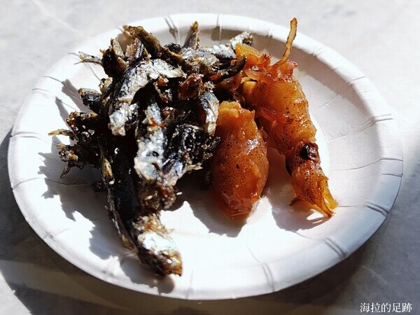 老闆招待的小菜-醃製的小管跟魚乾.