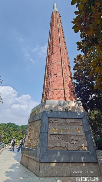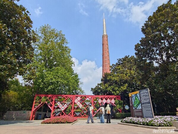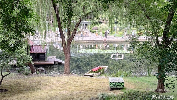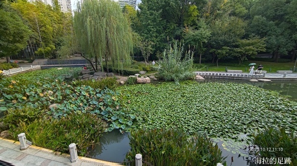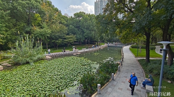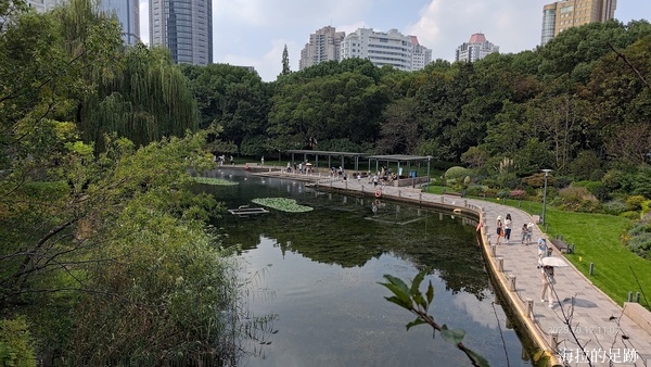 再往內走是一座造景湖, 名為匯金湖, 外型設計成黃浦江形狀, 沿著湖邊有一條步道. 海拉選擇走靠近大煙囪這邊的景觀天橋, 這座由鋼構和玻璃組成的天橋長約百來公尺, 是貫穿整個公園的空中走廊, 充滿現代氣息, 走在橋上可以居高臨下的觀賞公園的景色.