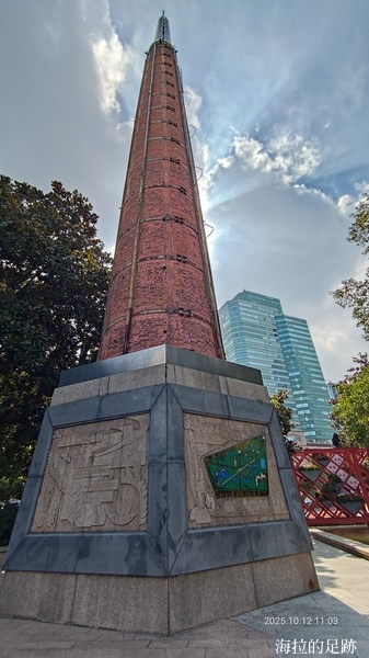 徐家匯公園是為了配合徐家匯商務開發、改善生活環境和空氣品質建造的人工綠地, 由加拿大蒙特婁W.A.A景觀設計事務所和上海園林設計院設計. 分為三期建設, 第一期為原大中華橡膠廠廠區, 占地3.3公頃, 保留了建於1926年的大煙囪並設置了長近200米的景觀天橋公園. 海拉由大煙囪這裡 (南門) 進入公園, 大煙囪原本高度28公尺, 徐家匯公園建造時, 在煙囪表面包裹一層類似纖維布的特殊材料, 用以防蝕加固. 並且將煙囪加高11公尺, 在其頂部安裝了一個不鏽鋼錐狀、鏤空且內部布滿光導纖維的新裝置.