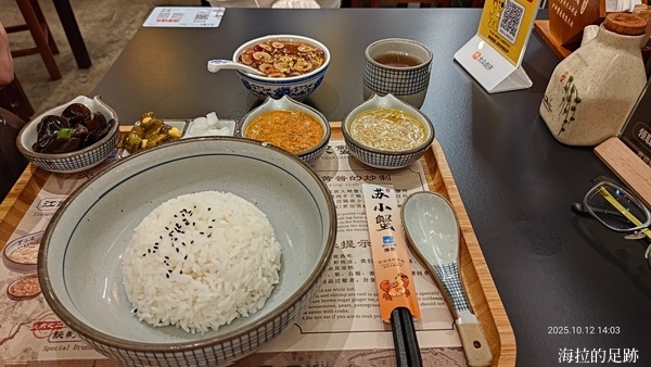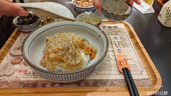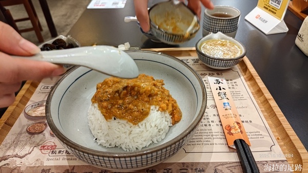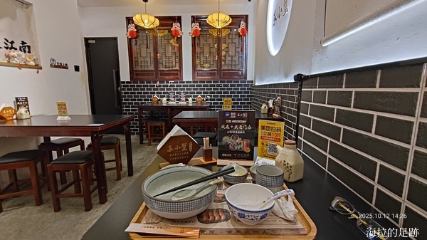 已經過了飯點, 所以店內沒什麼客人, 這樣也好, 不用人擠人或者排隊等位子. 看好菜單後跟服務員點了蟹黃麵跟甜品, 她郤讓我先上美團買卷, 我整個濛了. 把手機拿給她, 讓她直接幫忙操作, 我還跟她說麵的份量不用太多, 她建議我點飯, 份量比較少.