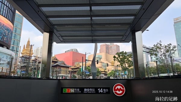 第一: 靜安寺地鐵站14號出口, 透過地鐵口的廊窗拍攝靜安寺.