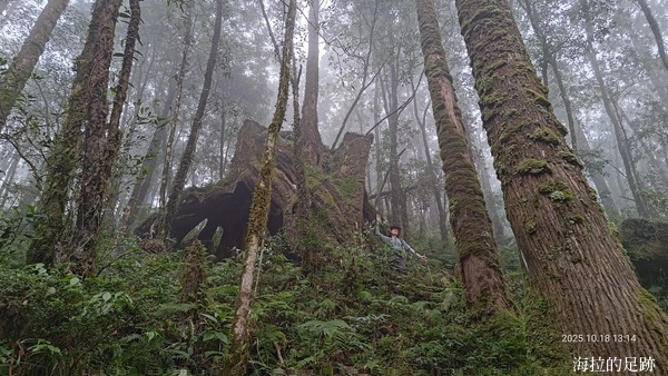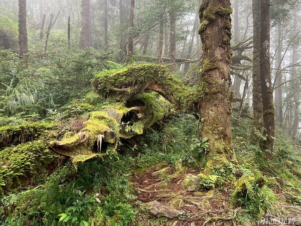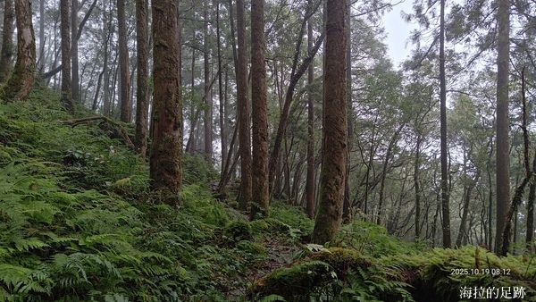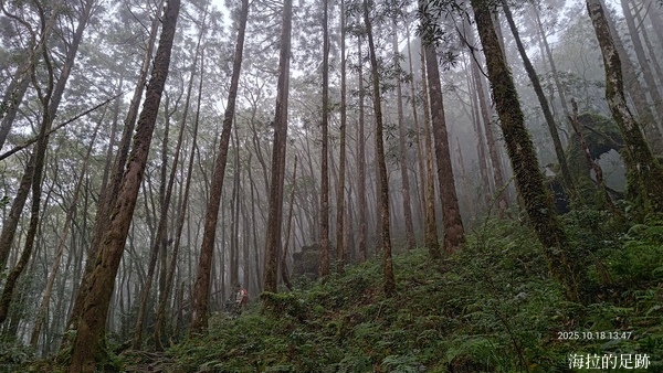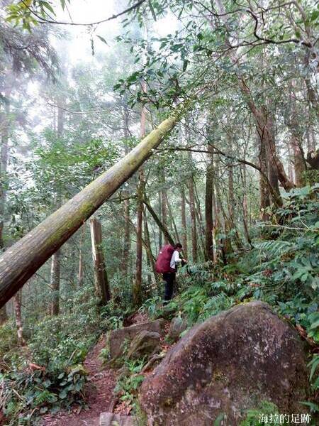這段路雖然不太好走, 沒有壯闊的山景視野, 但是走在山徑上, 偶爾抬頭仰望高挑挺拔的鬱翠杉木, 低頭小心腳邊軟爛的土灰色泥濘, 形成了強烈的色彩對比.