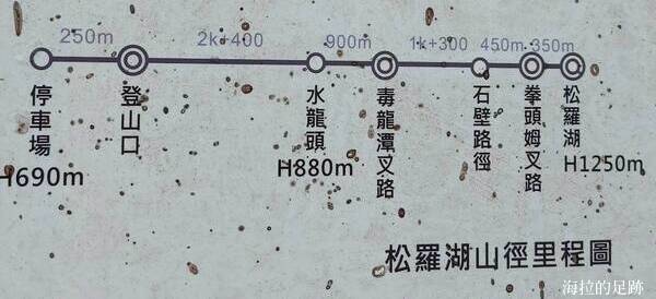 10:00新登山口 0K → 2.4K, 11:10水龍頭營頭, H880M → 0.9K, 12:36 毒龍潭 → 1.3K, 14:01 石壁路徑 → 0.45K, 14:33 拳頭姆岔路, → 0.35K, 15:00松蘿湖, H1250M (5.4K / 5H 含用餐, 拍照及休息)
