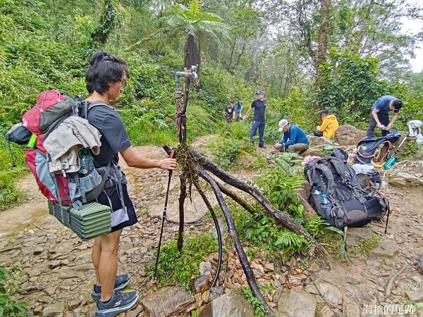 從登山口到水龍頭營地2.4公里, 平緩好走. 大家一路上嘻嘻哈哈, 輕輕鬆鬆地於11:10來到水龍頭營地, 這裡有個用樹枝架起來的水龍頭. 由於有水源也是這條步道最後的活水源, 所以是大家休息、取水及用餐的好所在. 我們雖然還不太餓, 但還是找了空位坐下來休息兼用餐.