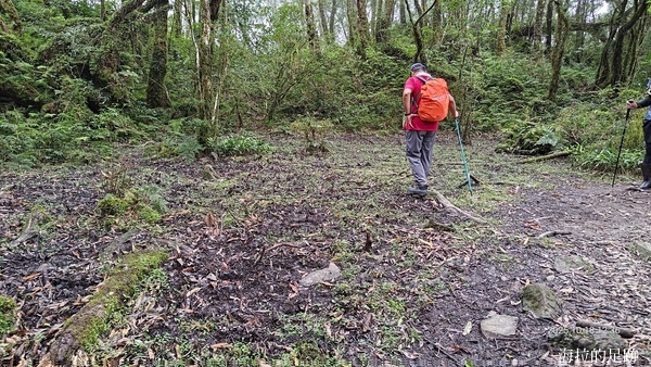 從大水塔登山口出發是平緩好走的步道, 不過走沒多久就會遇到松蘿湖的名產: 爛泥巴. 幸好, 大家都有備而來, 咱們有雨鞋, 不怕.