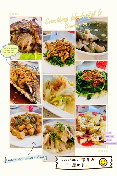 今天的菜色是紅燒肉, 香腸, 炒蛋, 金針菇炒絲瓜, 紅蘿蔔炒杏鮑菇, 炒高麗菜, 海帶排骨湯, 六菜一湯加五穀飯跟蘋果, 非常豐盛.