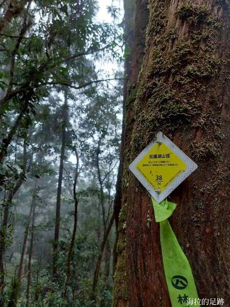 松蘿湖步道上每100公尺設立一個黃色編號的反光標誌, 登山口是00, 這裡38表示我們已經走了3.8公里, 終點松蘿湖是54.