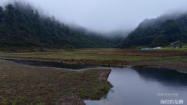 吃完飯天也黑了, 從現在開始到明天早餐前都是大家的自由活動時間. 海拉跟小霖二人摸黑在帳篷內用濕紙巾擦身跟換裝. 十月中下旬的松湖蘿夜晚, 黑燈瞎火, 沒有月光, 也沒有星星, 大家早早就互道晚安.