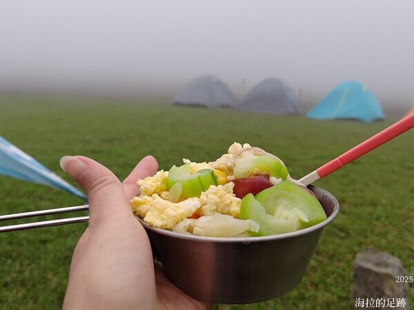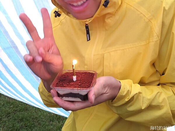 在山上可以吃到熱騰騰的飯菜, 真的是件很幸福的事, 協作一直鼓勵大家多吃點, 儘量把菜吃光. 別看海拉的碗小, 我可是吃了好幾碗. 飯後大家還幫鍾大哥慶生, 揹不了大蛋糕, 小霖買了個人份的提拉米蘇聊表心意.