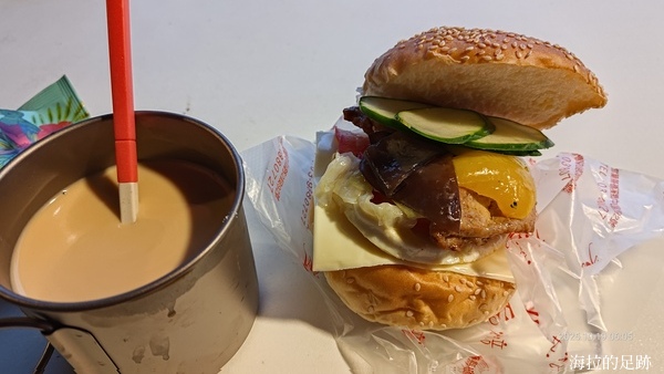 六點整, 我們的早餐備好啦! 雖然今天早餐有點曲折, 但菜色及內容很豐盛, 有二種不同口味的粥跟湯, 還有煎蛋、火腿腸、沙拉、炒青菜、起士片跟漢堡吐司, 中西合併. 海拉不愛湯湯水水的中式早餐, 自已做了個大漢堡配上自備的咖啡, 人間美味.