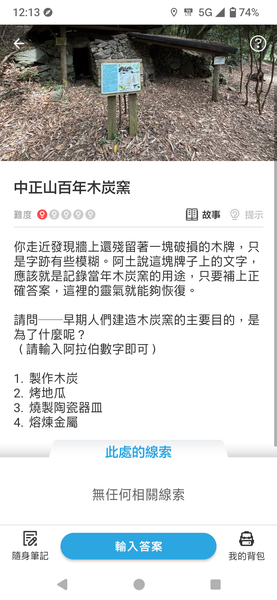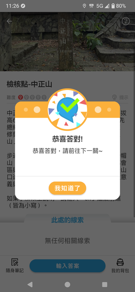 這裡有個檢核點, 來到這附近時, App 會自動跳出檢核點的視窗, 看完資料後輸入答案. 畫面上的背包就是玩家的所在位置, 未完成的檢核點是藍底黃色問號?, 已完成的檢核點變成紅底的綠色勾勾P.