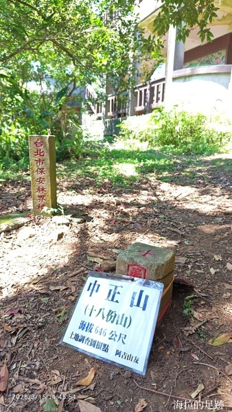 中正山原名彌陀山, 也叫十八份山或大竿林山, 早期為紀念先總統蔣中正先生於是在南坡山麓列植林木並修剪形成「中正」二大字, 而改名為中正山. 聽一起下山的山友說以前有看過「中正」二大字, 但今日來卻不見了.