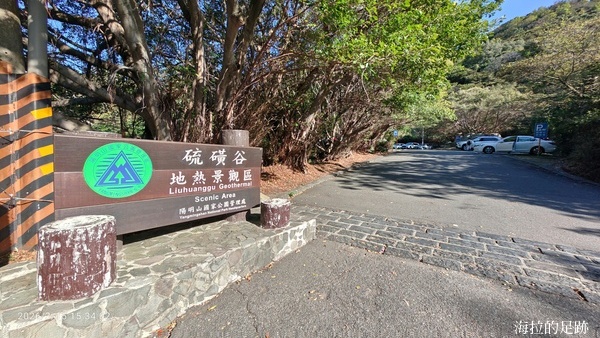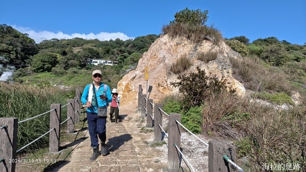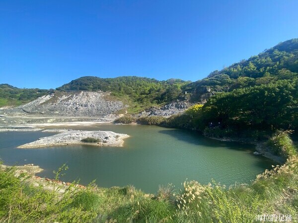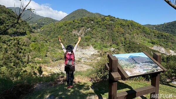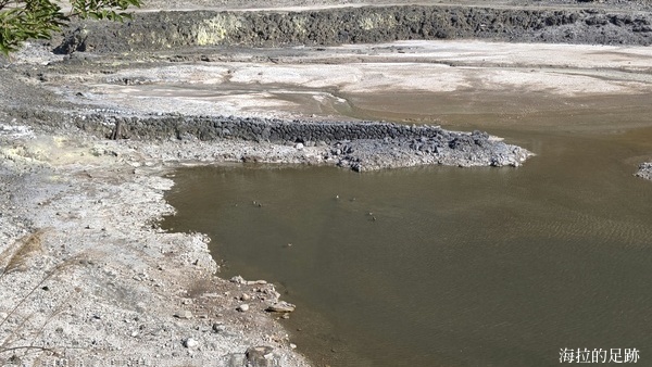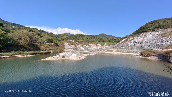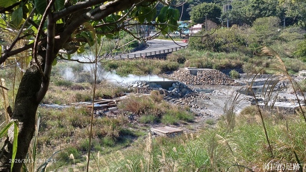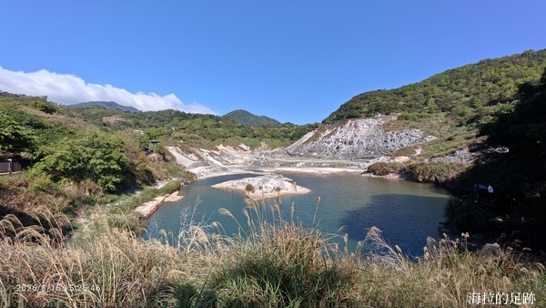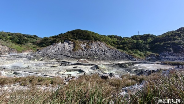 沿著步道繼續向前走, 邊走邊賞景, 看到這灰黑白的景像甚是荒涼. 硫磺谷是北投溫泉的泉源, 步道沿途可見多處地熱井, 是由臺北自然水事業處設置, 引水後形成溫泉, 供給下游地區. 此處泉質為白磺溫泉, 泉色呈黃白色, 含有白色湯花.