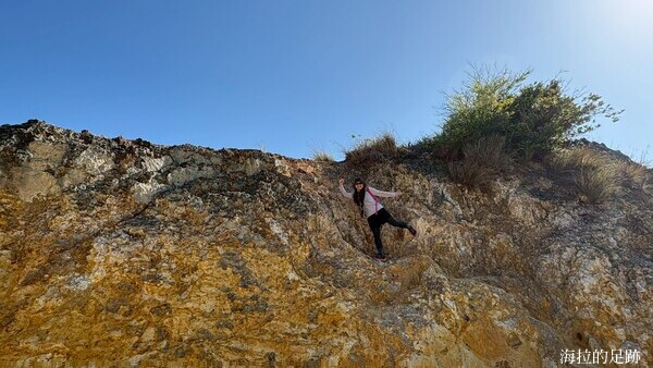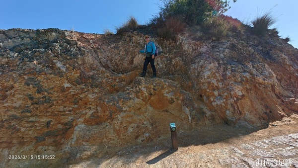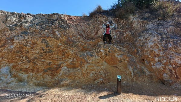 接著來到第三個檢核點-火山碎屑岩. 原本以為會是一堆細碎的黑色小石頭, 像富士山的路徑一樣. 沒想到這顆被火山活動噴發至此的火山碎屑岩這麼大一顆, 說它是個小土丘也不為過. 火山碎屑岩歷經歲月侵蝕風化後呈現紅褐、焦黃或灰黑的色彩, 交錯佇立於原有的沉積岩層中, 格外醒目.
