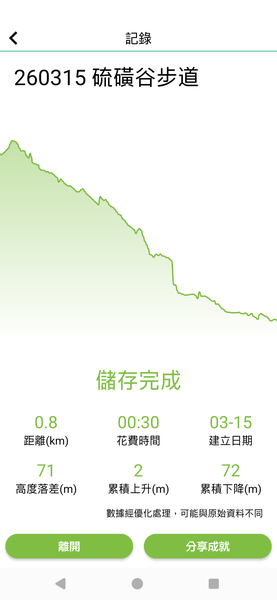 鳳凰谷山頭公園 & 硫磺谷步道行走記錄約800公尺, 邊走邊賞景及拍照花了半小時, 算是輕鬆愜意又老少皆宜的步道.