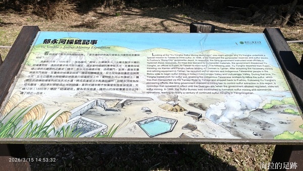 康熙三十五年, 福建福州火藥庫意外失火, 清政府急需補充原料, 決定派員前來臺灣採硫磺. 當時的臺灣中北部仍是充滿瘴癘之氣的荒野, 多數官員視為畏途, 唯有生性好奇、熱愛冒險的郁永河主動請纓. 康熙三十六年(1697年)春天, 他自臺南府城出發, 由南至北記述了所經之處的景色、各地平埔族群的風土民情, 歷經二十天嚴峻的旅程, 終抵淡水. 當乘船往內臺北內陸前行, 經過舊稱甘答門的關渡後, 一個遼闊無邊的湖面躍然眼前, 這段紀載也引發了後世學界對「康熙臺北湖」存否的爭論. 郁永河在湖畔設立營舍, 以布匹與原住民交換硫土煉製硫磺, 並親自深入今日的硫磺谷一帶觀察. 他在《裨海紀遊》中詳盡描寫了噴發孔散發的硫氣惡臭, 鞋底處傳來的溫度漸升, 更形容當地草木枯槁、毒霧漫天、噴氣聲如雷鳴震耳. 儘管環境惡劣險象環生, 工匠紛紛染病, 他仍憑藉堅韌意志, 費時五個月監工煉硫, 順利達成清廷任務, 也為臺灣早期史地人文留下珍貴的第一手文獻. (資料來源: 陽明山國家公園)