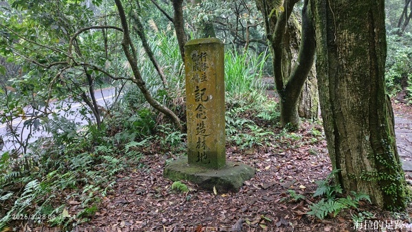 十多分鐘後來到陽明山遊客中心, 這裡是第二個檢核點, 可以休息, 要補水的話得等九點遊客中心開門後才能進去裝水, 廁所在外面, 隨時都可使用. 我們在這裡把外套都脫了, 然後往苗圃登山口前進. 不一會兒就到了行啟並御成婚紀念造林地石碑並獲得刻印.