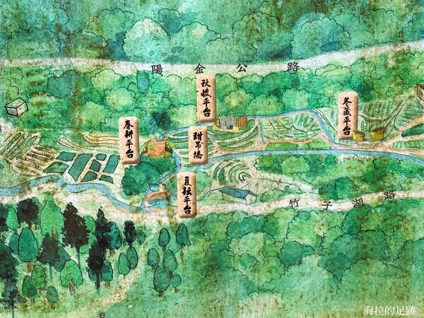非常懷舊古意的場景, 不管晴天雨天, 都是拍照的好景點. 旁邊不遠處還有一座紅色的小吊橋, 名為甜吊橋, 很甜美的名字.