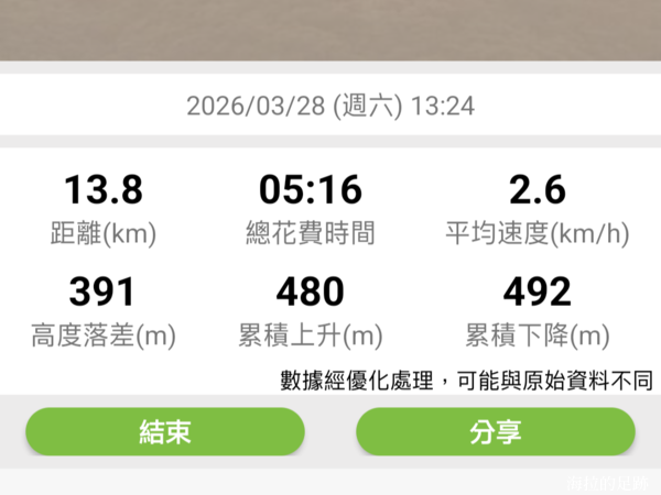 實際行走里程及時間記錄: 13.8 KM / 5:16 (使用健行筆記 APP做記錄)