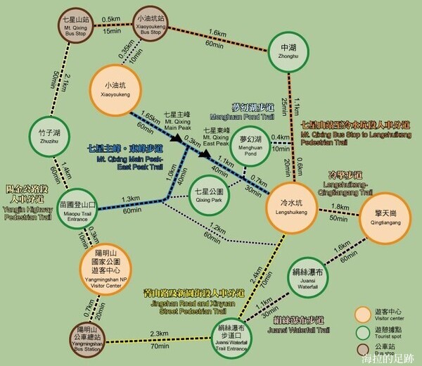 陽明山國家公園將環七星山人車分道設計為三段行程, 分別是: