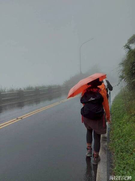 淒風苦雨中行走. 大家會不會覺得我們腦子有問題? 都刮風下雨了為何還不撤退? 在這樣的天氣下行走其實也算是一種訓練, 海拉跟山友小鈺秋天時打算去走朝聖之路, 所以要多練習這種長距離的健走, 尤其是在各種天候下行走, 這樣走朝聖之路時, 若出現相同的天候或狀況時才有經驗應對進退.
