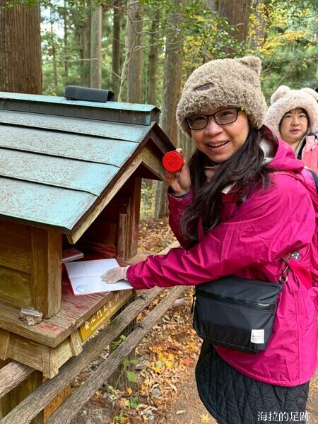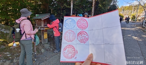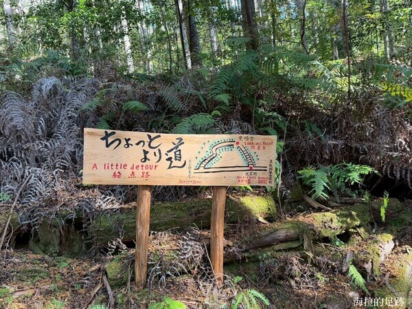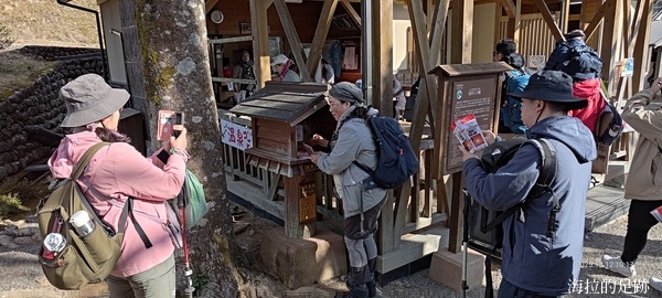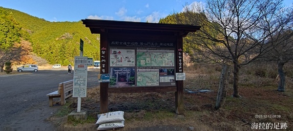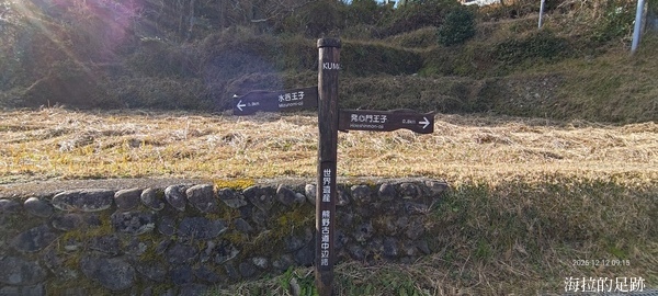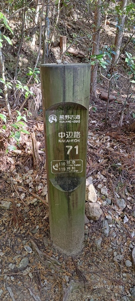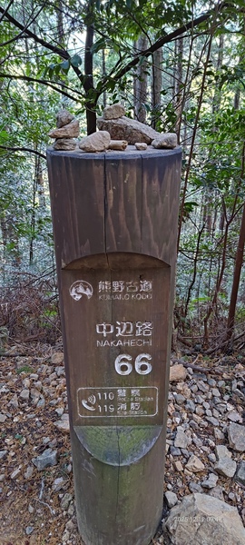 熊野古道, 特別是中邊路, 設有明確的里程樁和指標, 以瀧尻王子為起點, 沿途每隔約 500 公尺至 1 公里設置一根木製里程標柱. 這些標柱主要標記「到本宮大社的剩餘公里數」, 幫助健行者掌握步道進度, 並能有效規劃體力與時間. 不過這個里程樁要搭配地圖看才能較清楚地掌握當前行走的路徑及地點, 我們沒有紙本地圖, 也沒有下載離線地圖, 純粹無腦地跟著領隊走.