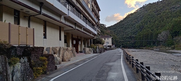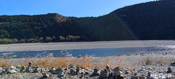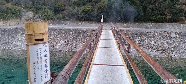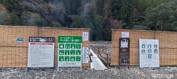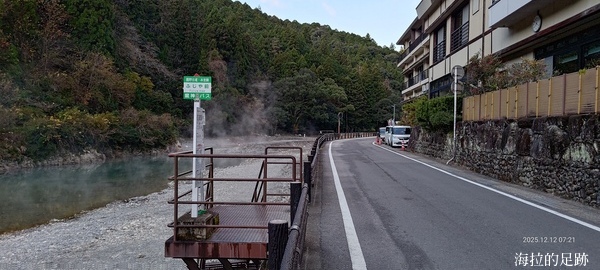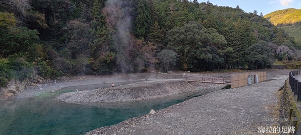 從旅館出來, 走過馬路, 循著鐵梯往下走到河床, 即可看到富士屋旅館在這裡設的大型露天溫泉「仙人風呂」. 仙人風呂六點半開始, 一大早我們起不來, 現下的時間又不夠多, 所以我們就在河邊走走跟拍照.