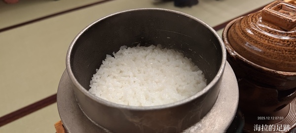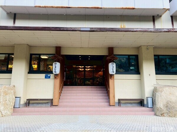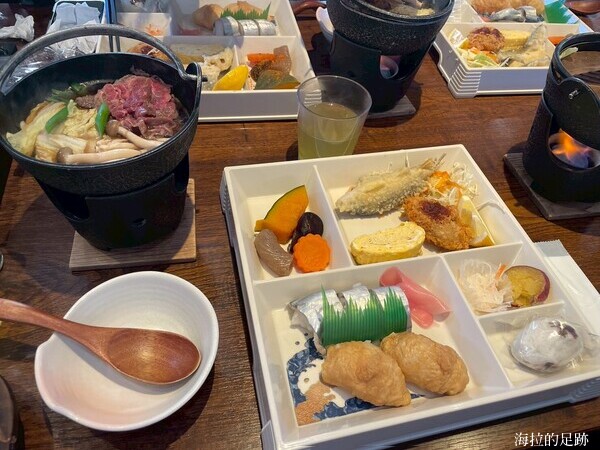 終於走完熊野古道中邊路, 也蓋完所有的章, 大家早已飢腸轆轆. 來到餐廳到這菜色, 大家都面露難色, 這能吃飽嗎? 海拉食量小所以量對我來說, 但這餐食內容令我難以下嚥. 中間的魚看起來像生的白帶魚, 雖然團友吃了後說它是熟的, 我還是把它丟到鍋裡再涮一下才吃. 除了它還有炸魚, 不喜歡吃魚的我, 還是把它們都吃光光, 不能浪費食物.