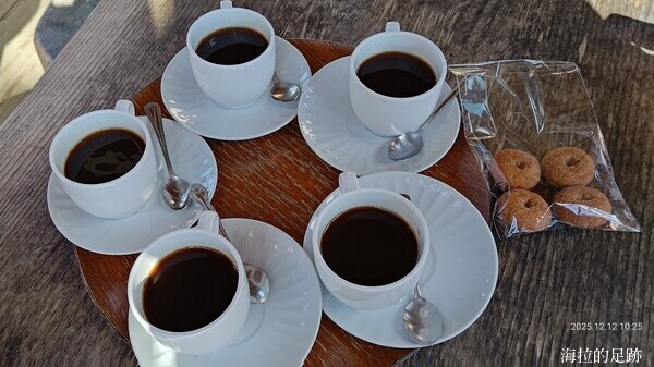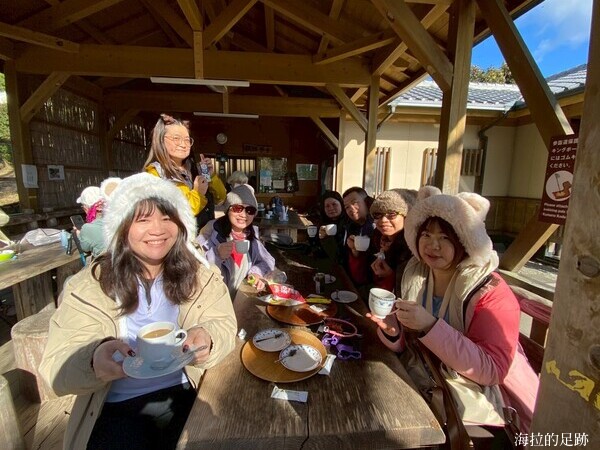 來到這兒已經十點半多, 正好喝早茶. 我們每個人都點了一杯熱的溫泉咖啡, 一杯200日元, 有人買了小餅乾, 大部份的人都拿自己帶的行動糧出來啃. 不愛喝黑咖啡的我都覺得這溫泉咖啡溫和入口, 沒有苦味及酸味.
