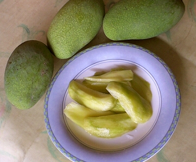 本身也很喜歡吃芒果,不過,土芒果的纖維較多,雖然香氣十足,但是直接吃容易塞牙縫,我想到的是作成果醬及情人果,因目前都還是青果,就先來試作芒果青,也就是情人果吧!爬文看了一下,也不難作,就先採了十顆大果來嘗試囉!