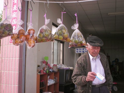 今天還有一個目的就是找醃脆桃,剛好隔壁就有在賣,這位阿伯居然已經九十歲了,還能作生意,他先拿一個要我試吃,嗯,真的很入味,又不會太硬,那就當然要買囉,拿出店的名片,他說他已經賣了幾十年,有些人還一口氣就買上千元以上耶!