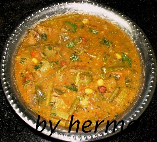 吃白米糕時會配合一種湯一起吃,這種湯的Hindi文叫Sambar,聽起來像「桑巴舞」(Samba)的唸法,所以我稱呼它叫「桑巴湯」。實際上,「桑巴湯」是由很多材料混合的,主要的材料是「扁豆」(lentil),紅色豌豆(dal),青椒,茄子,蕃茄,和椰子粉(coconut powder),香菜(coriander),紅蘿蔔(carrot),馬鈴薯……等等,當然還要加香料和黑胡椒,煮成一鍋「桑巴湯」,倒也名符其實。