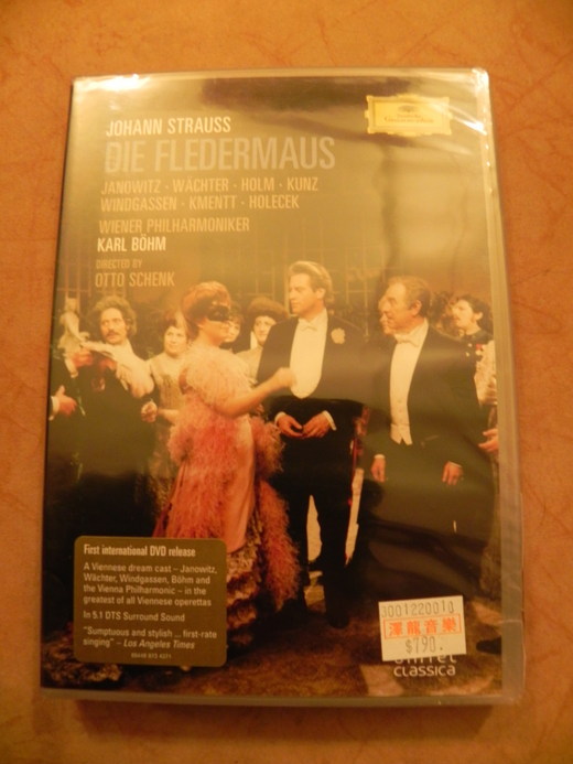 這次回台北在成都路上的「澤龍唱片」發現不少驚奇的寶貝,貝姆詮釋的「蝙蝠」就是其中之一,雖然我已經收藏了CD,碰到DVD我竟然還是束手無策,只好投降,乖乖買下來。