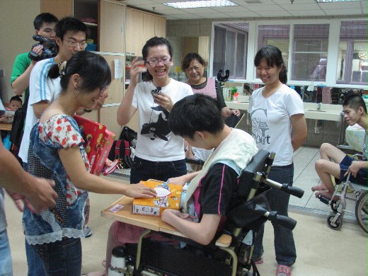 跳完兩首帶動唱以後,夥伴們拿出事先準備好的卡片,每個人輪流唸出要給孩子的祝福,希望他們能夠開開心心、快快樂樂的,字裡行間充滿鼓勵和支持的話語,隨後再附上送給孩子的零食。「這是我要送給你的卡片還有餅乾,請你收下,希望你在接下來每一天都能夠快快樂樂、開開心心的,永遠笑咪咪的好不好?」有些孩子雖然不能張開嘴巴順利的回應我們,但是只要看到他們的笑容,其實就會知道,我們希望他快樂的心情,他是可以感覺到的。在這段時間,我就坐在一位小妹妹後面,剛開始她對我其實非常冷淡,但是經過一整個早上的相處,中午我還餵她吃飯、喝湯,我們之間的關係也慢慢的越來越好。在最後面她還會笑笑的拉扯著我的頭髮,我知道她是在和我玩,所以即使會覺得痛也不是非常在意。在發卡片的同時,坐在後面的我,其實眼淚是一滴一滴的偷偷流下來的。但是在流下來沒多久後我就會立刻把它擦掉,因為我不希望在這個歡樂的氣氛,有任何孩子看到我流下來的這些眼淚。