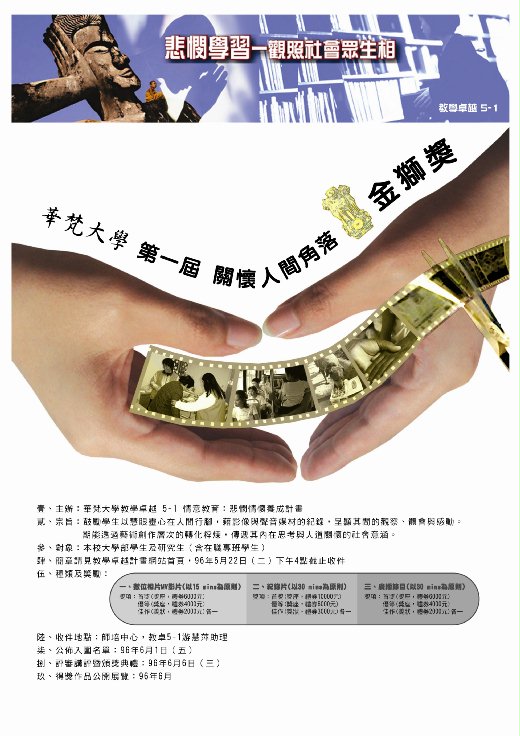 貳、宗旨:鼓勵學生以慧眼靈心在人間行腳,藉影像與聲音媒材的紀錄,呈顯其間的觀察、體會與感動。期能透過藝術創作層次的轉化粹煉,傳遞其內在思考與人道關懷的社會意涵。